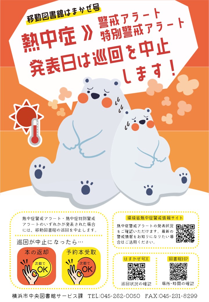 【はまかぜ号】令和6年度から、熱中症警戒アラート又は熱中症特別警戒アラートが発表された場合は、はまかぜ号の巡回を中止します。ご注意ください。#横浜市立図書館#移動図書館#はまかぜ号036