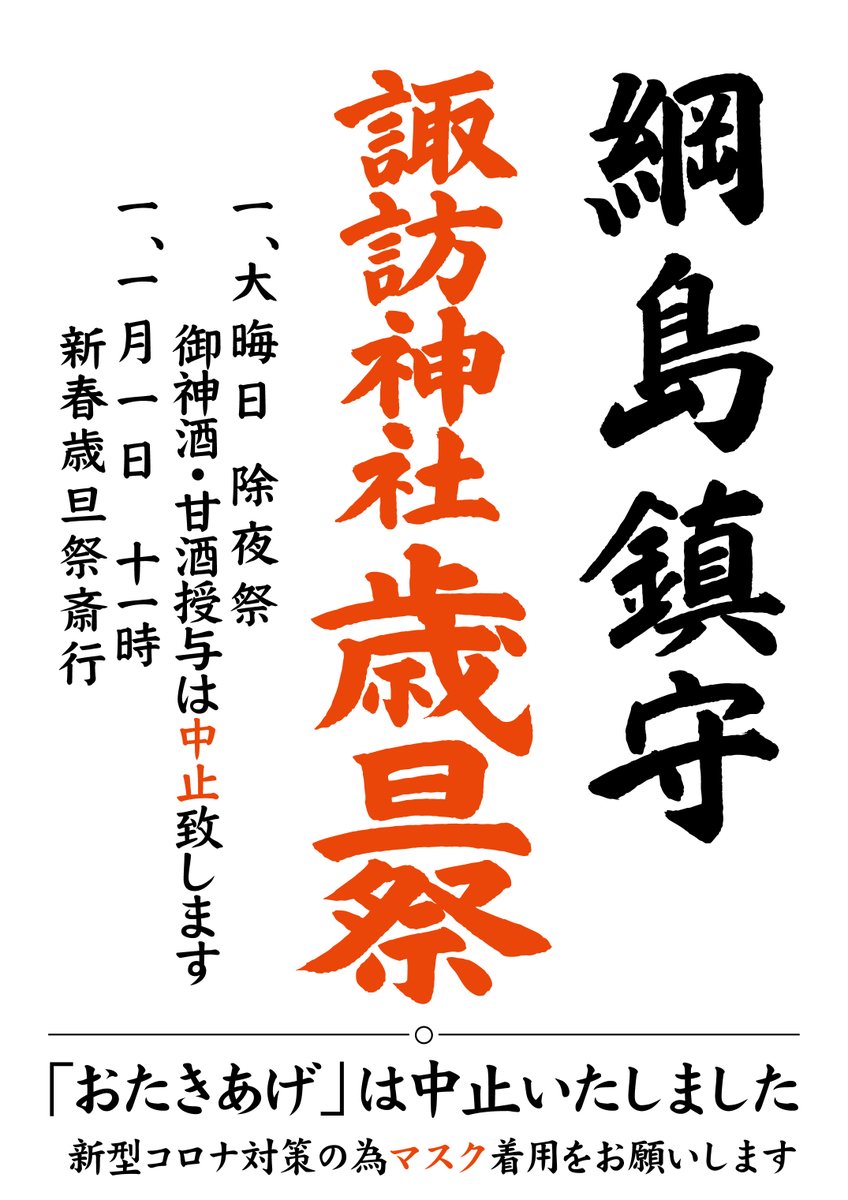 初詣は地元綱島の#諏訪神社へ!◆綱島鎮守 #諏訪神社歳旦祭・12/31 大晦日 除夜祭(御神酒・甘酒授与は中止)・1/1 11:00~新春歳旦祭斎行マスク着用をお願いしております。なお、「おたきあげ」..