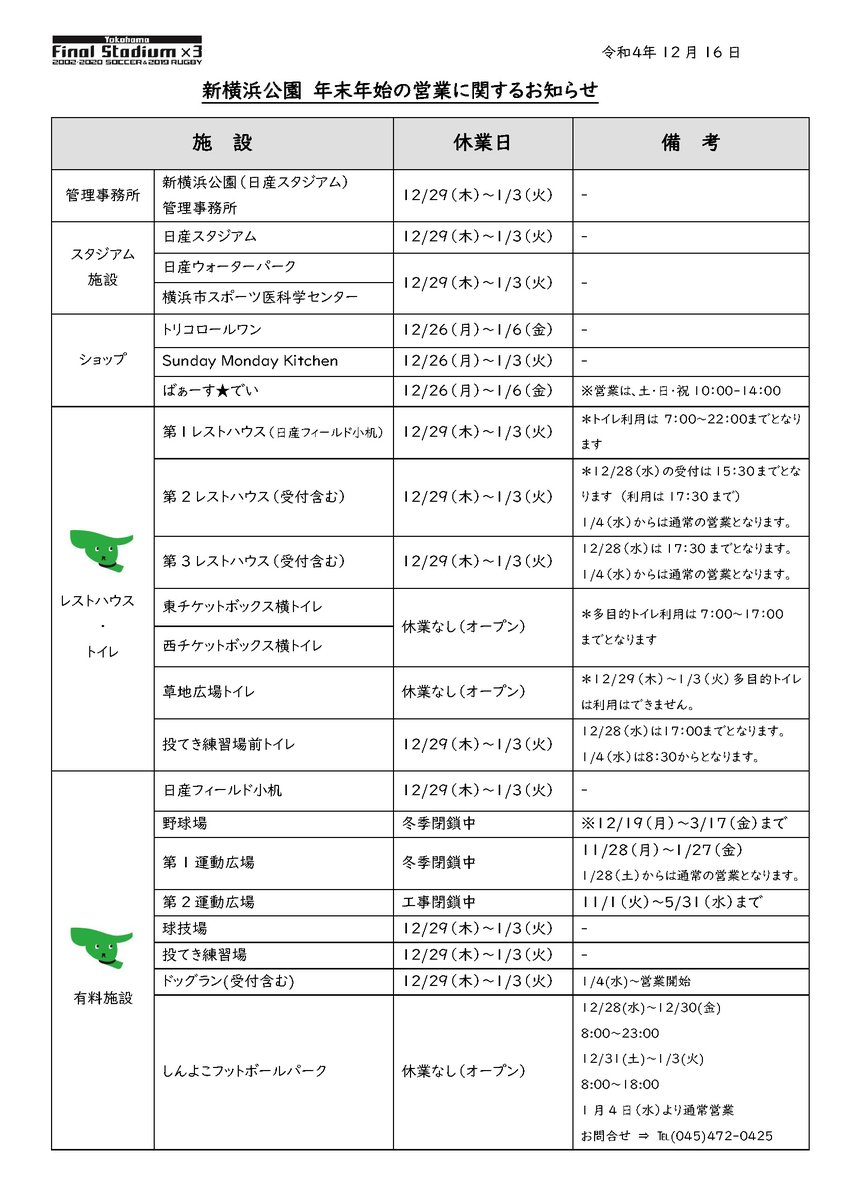 【新横浜公園からのお知らせ】新横浜公園では、2022年~2023年の年末年始にかけて営業時間が変更になる施設がございます。詳しくは、新横浜公園HPをご確認ください。www.nissan-stadium..