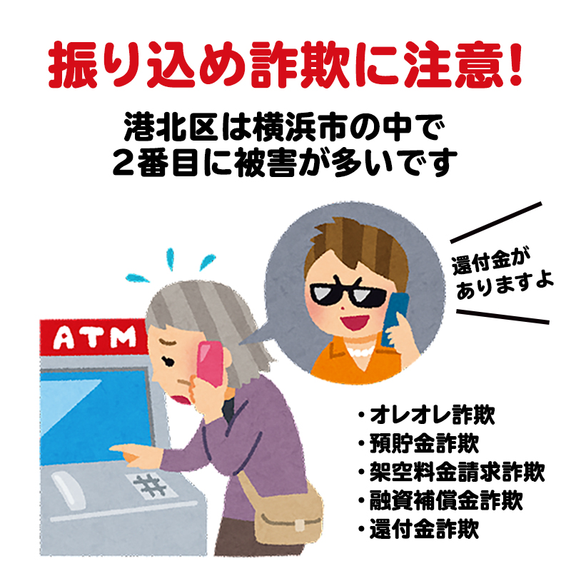【#港北警察署よりお願い】振り込め詐欺に注意❗港北区が横浜市の中で特に#特殊詐欺被害が多く、綱島近辺も非常に狙われています。◆発生件数(令和4年1月~11月)・港北区内 84件 被害額 約1億6,53..