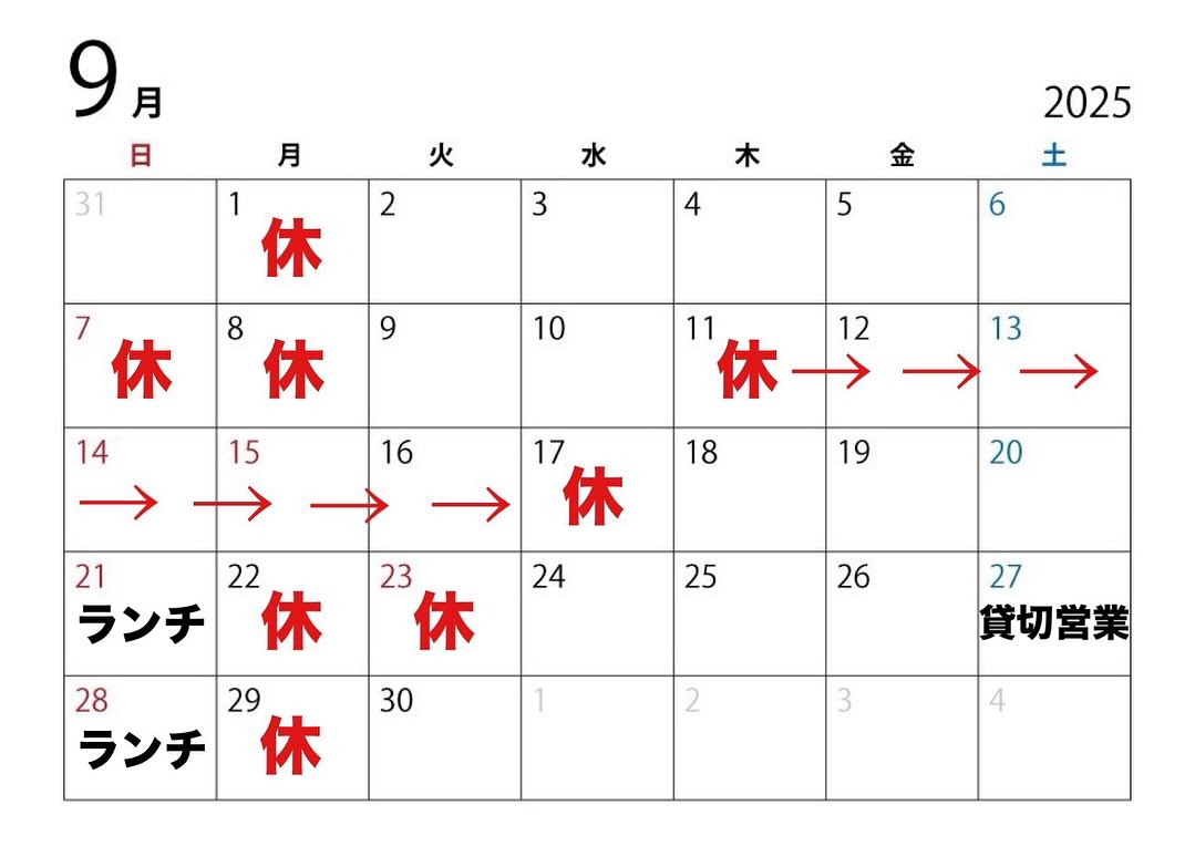 こんにちは!魚はるです🐟9月の営業日のお知らせです💁♂️すみませんが、11(木)〜17(水)まで、家族サービス(全力)の為お休みをいただきます🙇♂️ランチは21(日)28(日)の2週連続になります..