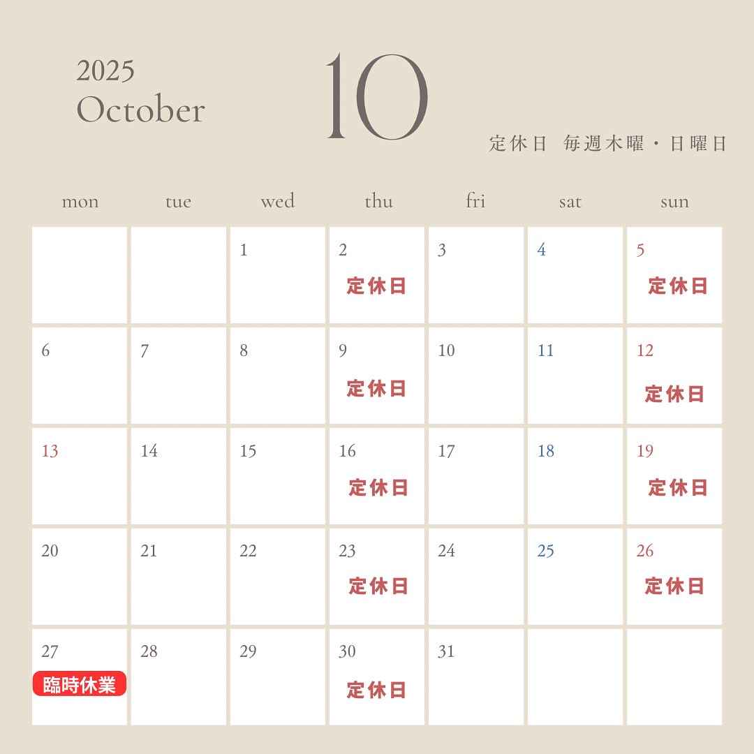 こんにちは✨️10月の営業日のお知らせです。定休日は、木曜・日曜日です。誠に勝手ながら、10/27(月)は臨..