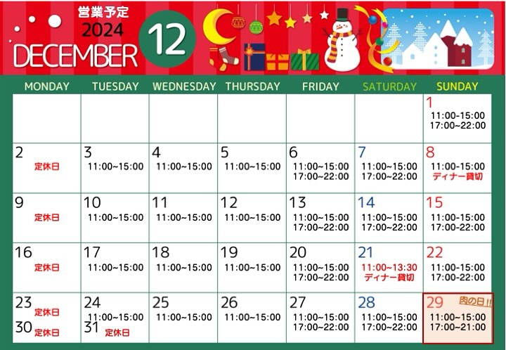 12月の営業です!貸切等のご予約が増えて来ておりますので、ご来店の前にお電話にてお問い合わせいただけ..