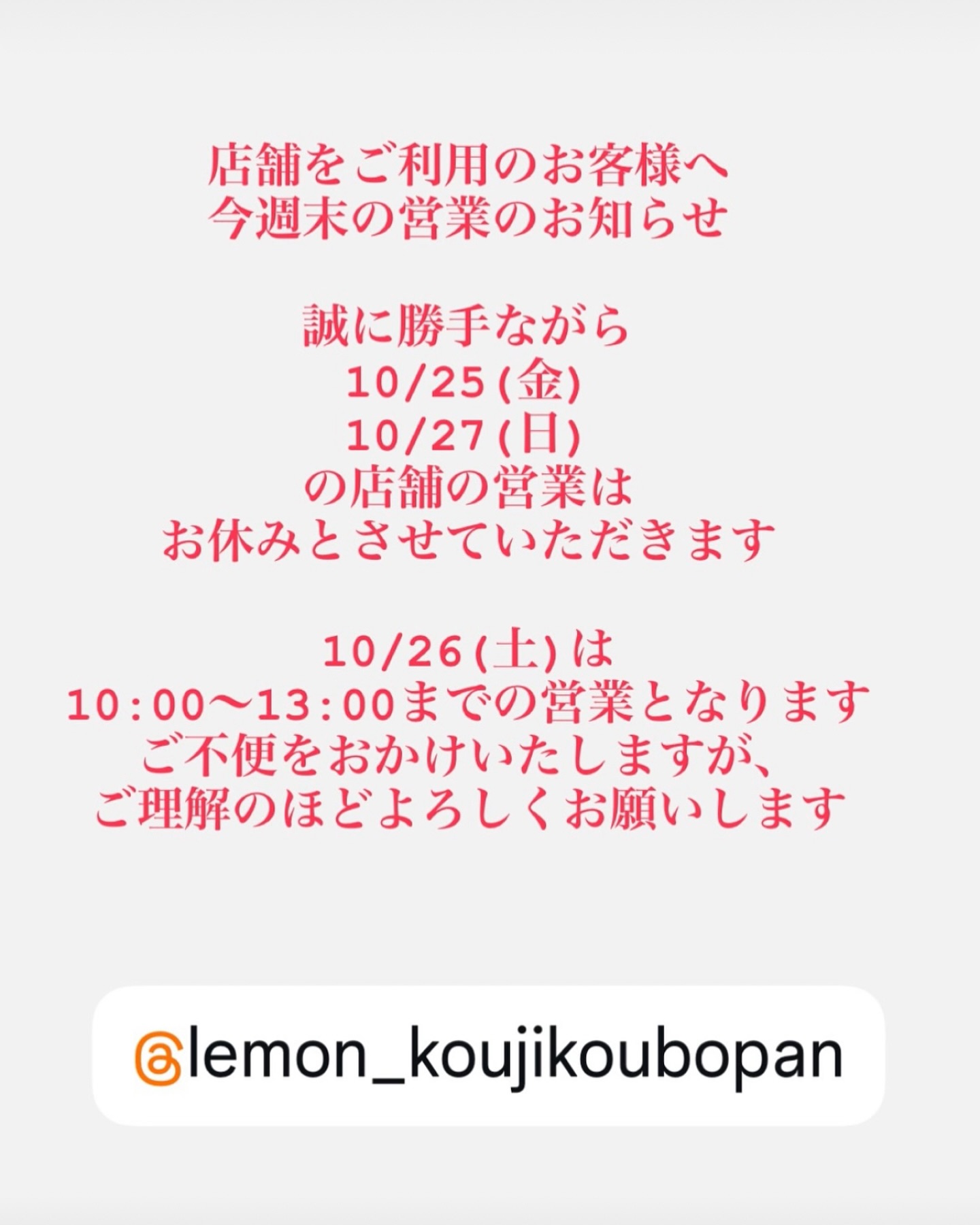 麹自然発酵ぱんLemonです。今週末の営業に関して、誠に勝手ながら10/25(金)は店舗設備点検の為、10/27(日)は複数のイベント出店の為店舗の営業はお休みとなります。10/26(土)は10:00..