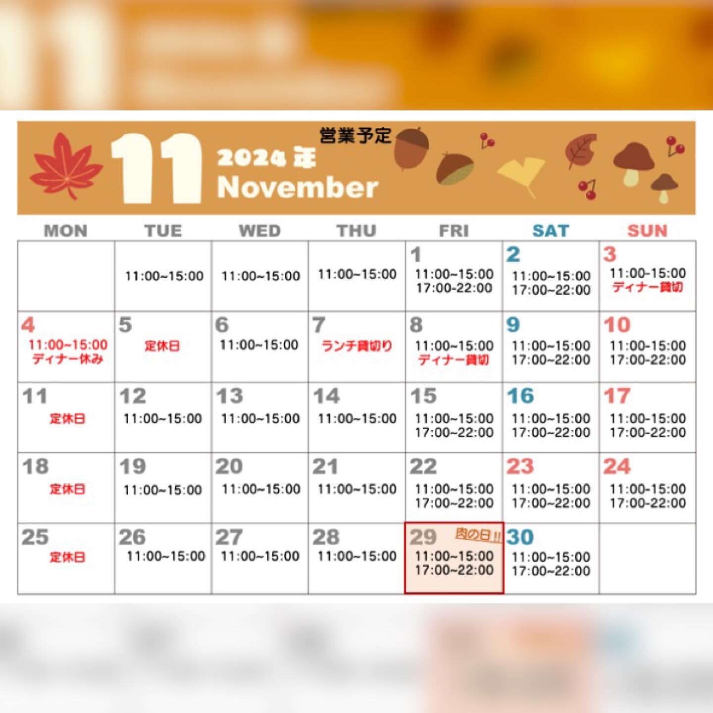 11月営業予定です💁11月から貸切営業が増えております!今後も増える事があると思うので、ご来店前にご確..