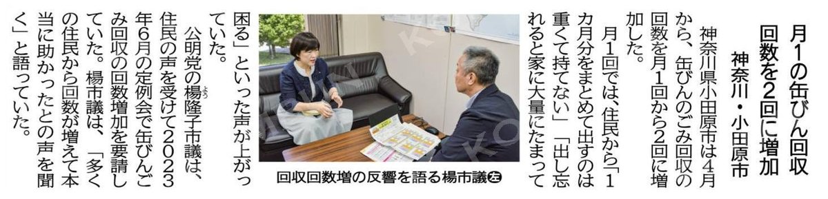月1の缶びん回収、回数を2回に増加/神奈川・小田原市#公明新聞電子版2024年07月17日付https://komei.or.jp/newspaper-app/