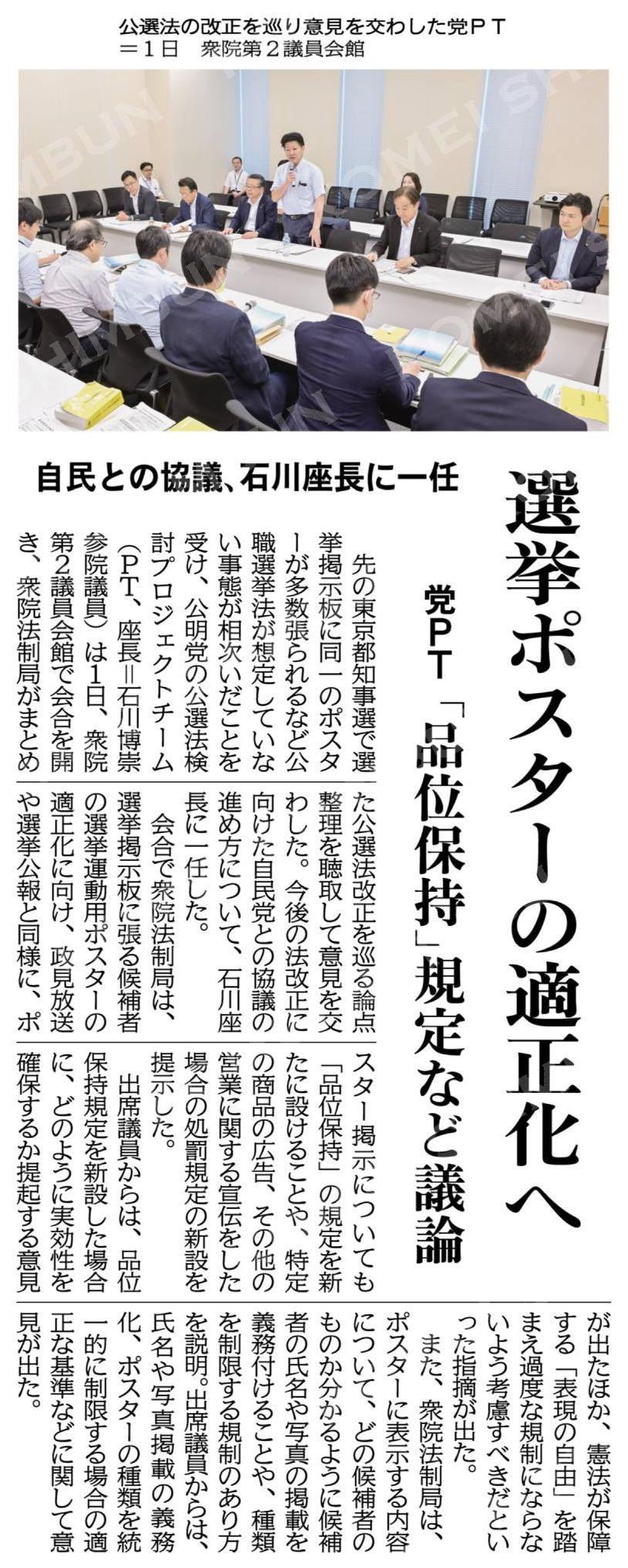 選挙ポスターの適正化へ/党PT、「品位保持」規定など議論/自民との協議、石川座長に一任 #公明新聞電子版 2024年08月02日付 https://komei.or.jp/newspaper-app/