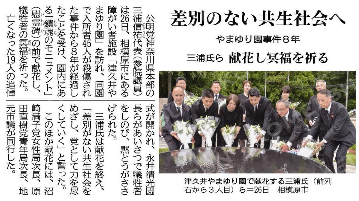 (やまゆり園事件8年)差別のない共生社会へ/三浦氏ら、献花し冥福を祈る #公明新聞電子版 2024年07月27日付 https://komei.or.jp/newspaper-app/