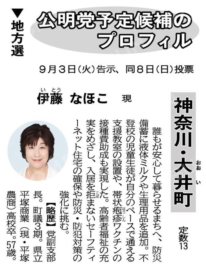 (党予定候補のプロフィル)伊藤なほこ 現/神奈川・大井町=定数13/9月3日(火)告示、同8日(日) #公明新聞電子版 2024年08月04日付 https://komei.or.jp/newspaper-app/