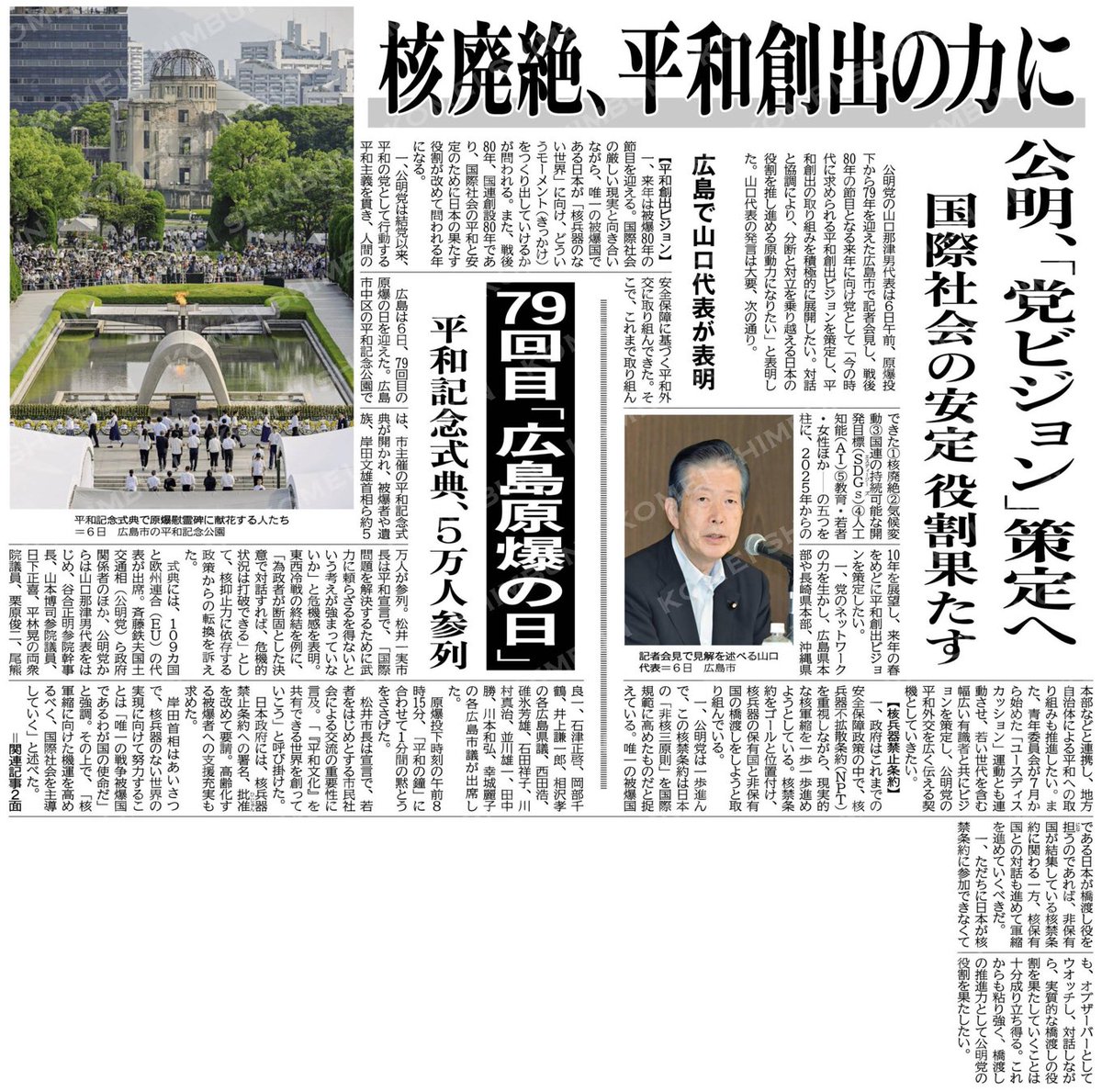 (79回目「広島原爆の日」)核廃絶、平和創出の力に/公明、「党ビジョン」策定へ/広島で山口代表が表明 #公明新聞電子版 2024年08月07日付 https://komei.or.jp/newspaper-app/