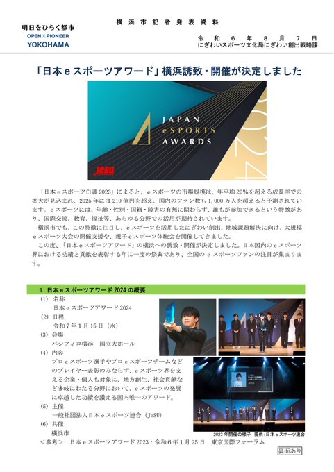 「日本eスポーツアワード」横浜誘致・開催が決定しました」横浜市記者発表資料#eスポーツ#横浜#eスポーツアワード