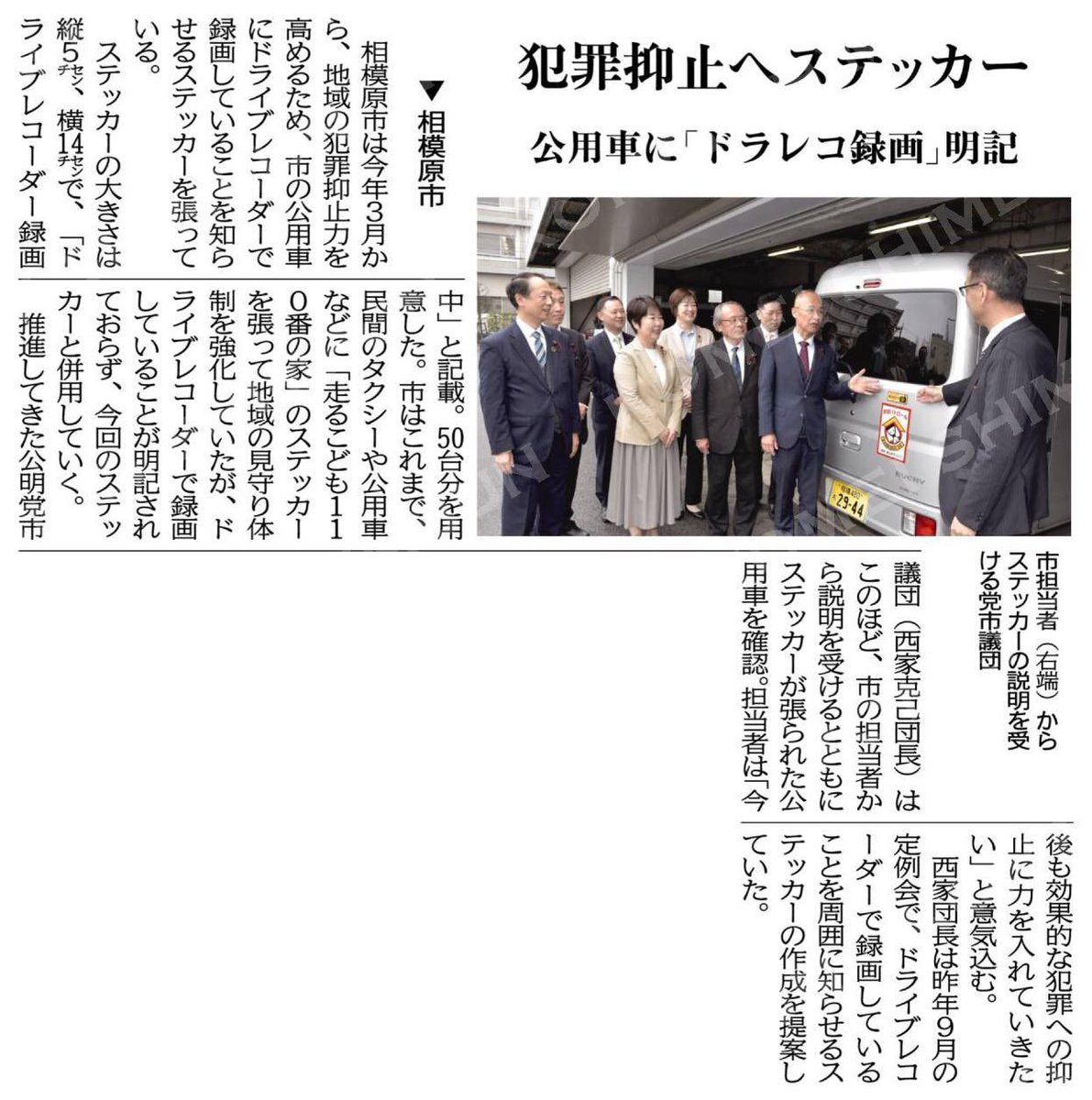 犯罪抑止へステッカー/公用車に「ドラレコ録画」明記/相模原市#公明新聞電子版2024年04月14日付www.komei.or.jp/newspaper-app/026