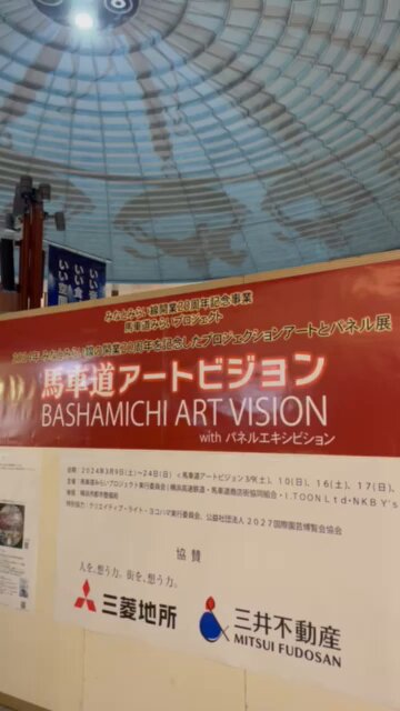 馬車道駅の改札内ドーム天井に映し出される、映像作家I.TOON伊藤有壱氏による大型円形アートプロジェクション「アートビジョン」!Ⓜ️みなとみらい線開業20周年パネル展も開催中!※馬車道駅、2024年3..