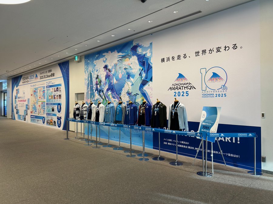 #横浜マラソン2025 は、いよいよ今週末開催です! 現在、横浜市庁舎2階では10周年を記念した特別展示を開催中 歴代Tシャツやメダル、これまでの歩みを振り返る壁面パネルを展示しています。