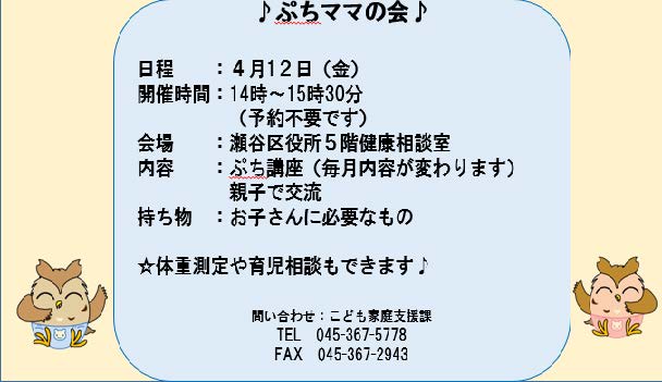 ♪ぷちママの会♪10代から20代前半の妊婦さんやお母さんとそのお子さんが集まる会です。4月のテーマは「マ..