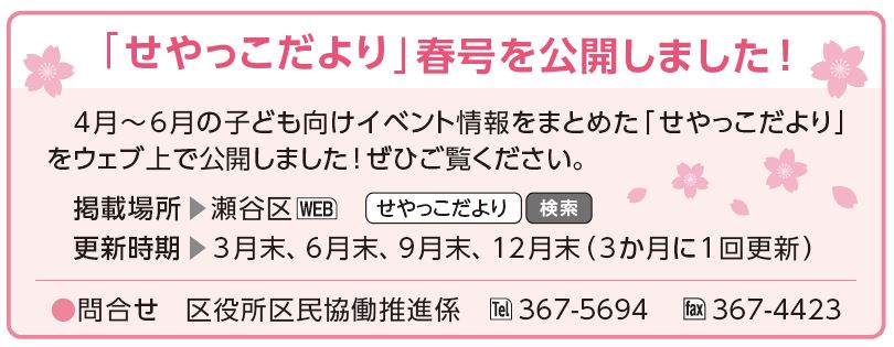 【せやっこだより春号公開🌸】瀬谷区内の施設等で開催される子ども向けイベント情報を瀬谷区WEBで公開中!お子さんが楽しめる4~6月のイベントがもりだくさんです♪ぜひご一読ください。www.city.yo..