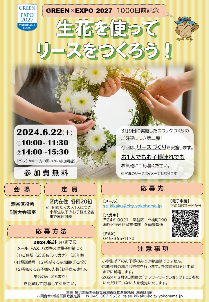 【生花を使ってリースをつくろう!】GREEN×EXPO2027開催1000日前を記念して、リースづくりを開催します。お1人でもお子さま連れでも楽しめるワークショップにぜひご参加ください!🌼開催日時6/..