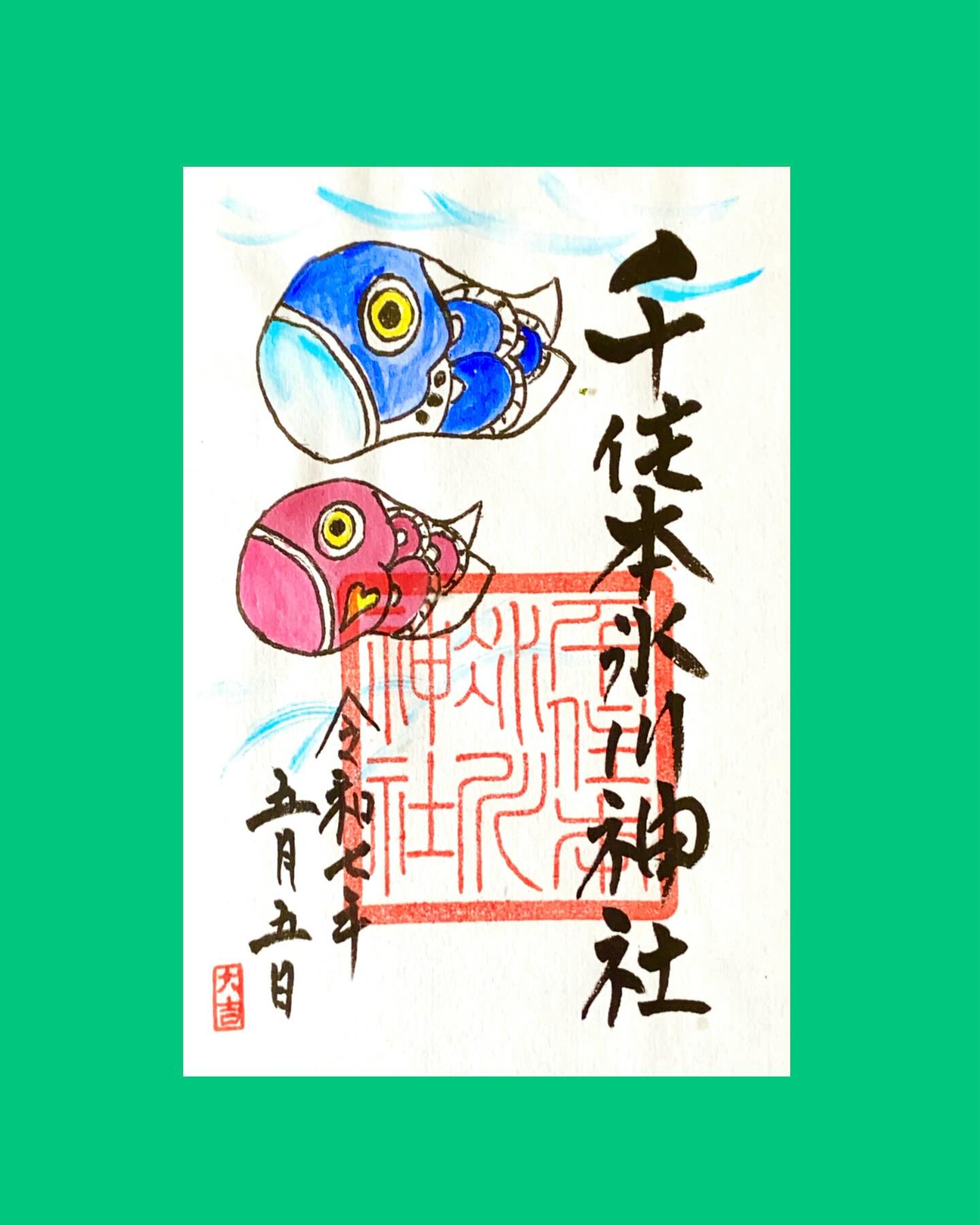 ..季節の限定ご朱印【こいのぼり】新緑の眩しい季節薫風の空に元気よく泳ぐこいのぼりをご朱印に描きまし..