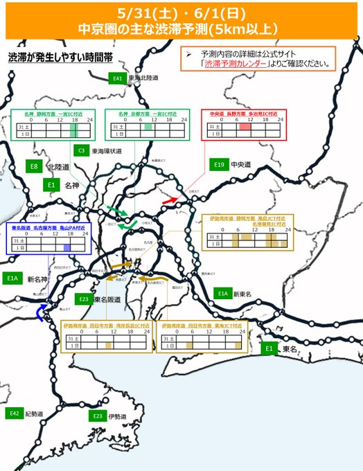 【今週末の#渋滞予測】渋滞を避けるには、渋滞予測であらかじめ混雑が予測される時間帯をご確認いただき、出発時刻を調整することが有効です。東海エリアの渋滞予測は、リンク先に掲載しています。ぜひご覧ください..
