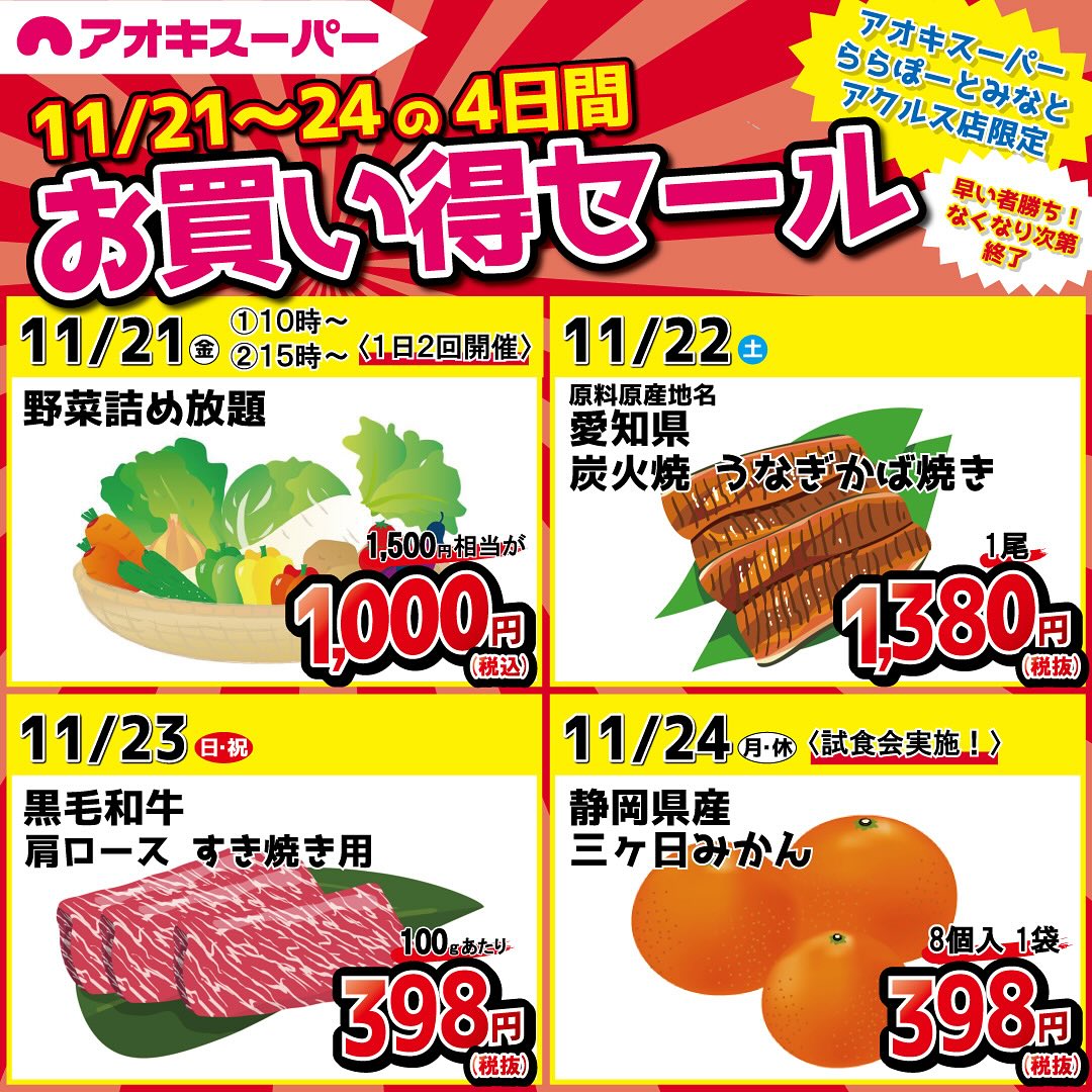 アオキスーパーららぽーとみなとアクルス店限定の特別な4日間!詰めて・焼いて・味わう!秋の味覚が日替わりでお買い得プライスで登場!【期間】2025/11/21(金)~11/24(月・休)【内容】11/2..