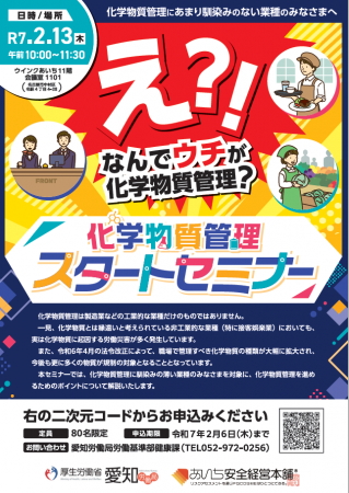 2月は「#化学物質管理強調月間」です。愛知労働局では、化学物質管理に馴染みのない業種のみなさまを対象として、化学物質管理を進めるためのポイントについて解説する「化学物質管理スタートセミナー」を実施しま..