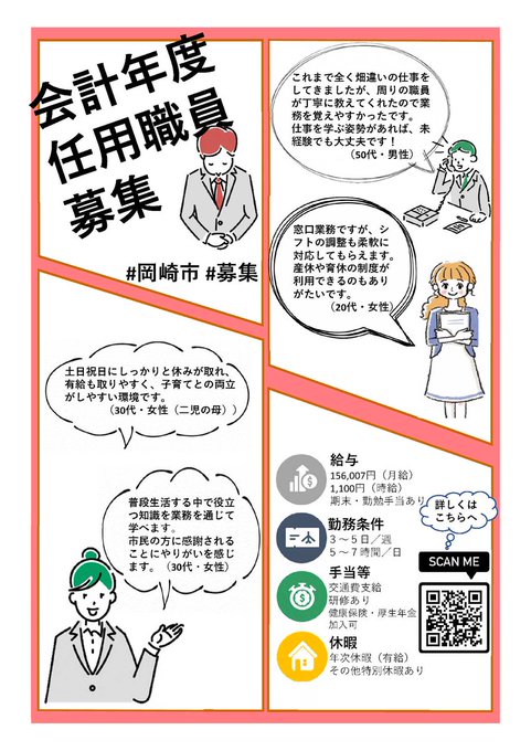 【岡崎市役所で働きませんか?】本庁や支所等の市内各施設で事務の補助を行う非常勤職員を募集しています。様々な年齢、性別のかたが活躍中です(働く職員の声をチラシに掲載しています)募集案内などの詳細は市HP..