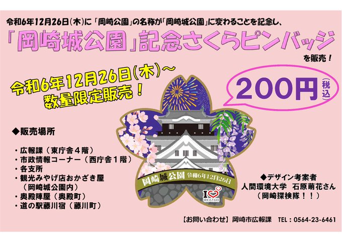 【「岡崎城公園」記念さくらピンバッジを販売します】令和6年12月26日(木)に「岡崎公園」の名称が「岡崎城公園」に変わることを記念して、数量限定で販売!販売開始日★12月26日(木)~価格★200円(..