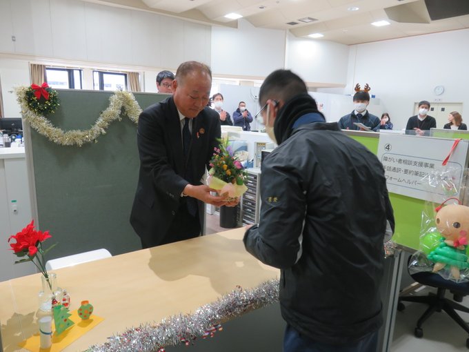 12月17日(火)に愛知県立みあい特別支援学校の生徒さんがフラワーアレンジメントを届けてくれました。届けてくださったお花にはそれぞれにテーマがついています。社会福祉センターご来館時、テーマとともに素敵..