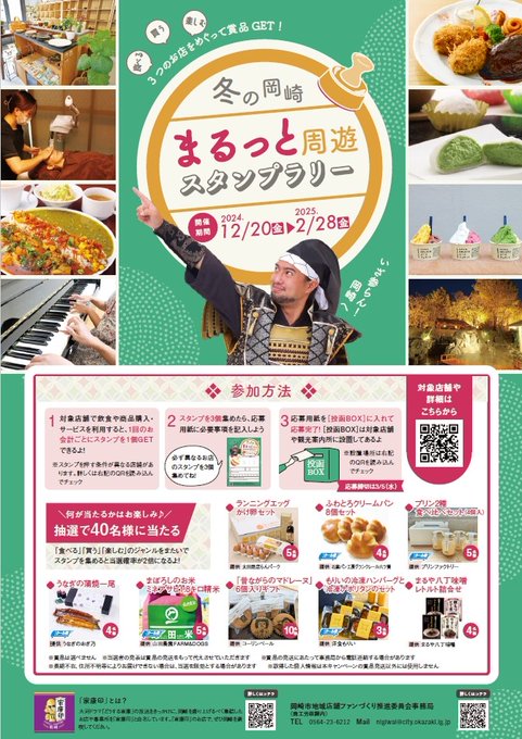 【豪華グルメが当たる!「冬の岡崎まるっと周遊スタンプラリー」開催中】対象店舗で飲食や商品購入、サービス利用をして3つのお店のスタンプを集めると、市内店舗のグルメが当たるキャンペーンを開催中!ぜひご参加..