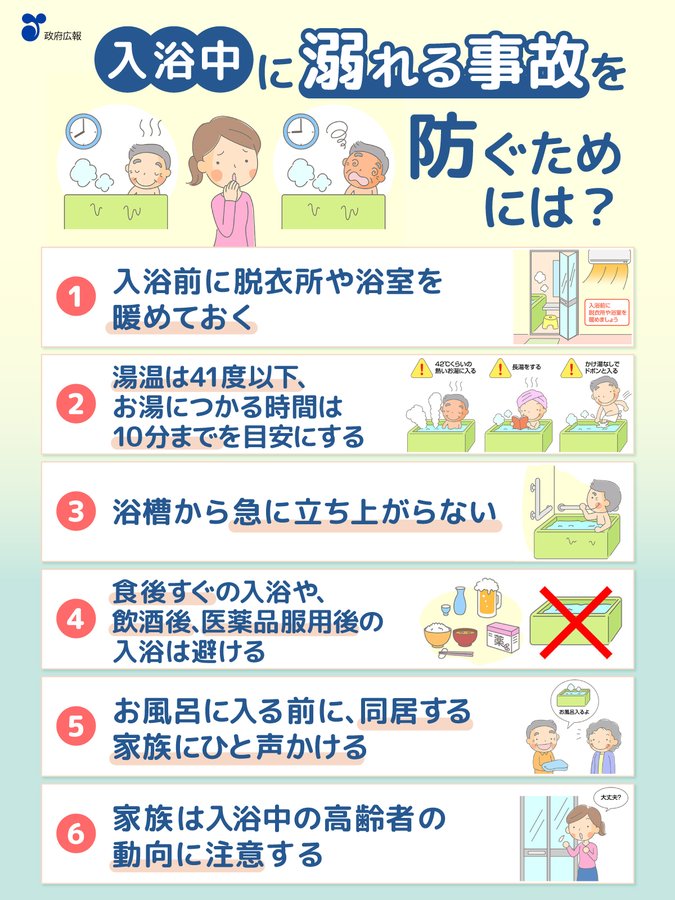 ◥◣気をつけよう!入浴中の事故◢◤寒い時期は、特に高齢者が入浴中に亡くなる事故が急増交通事故で亡くなるかたの2倍にも「自分にも起きるかもしれない」という予防意識を持って、しっかりと対策をとりましょうh..