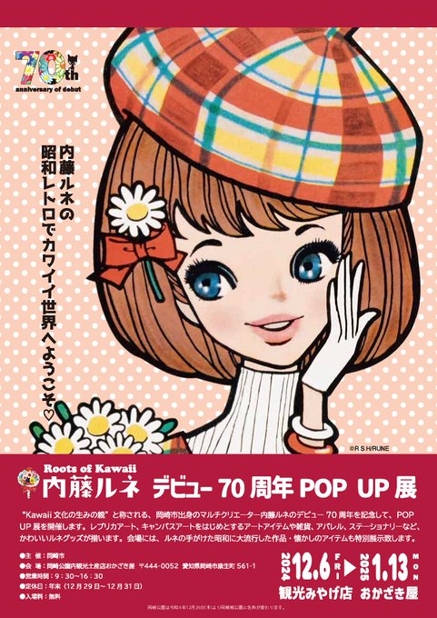 【RootsofKawaii内藤ルネデビュー70周年POPUP展開催】岡崎市出身の内藤ルネ氏が手掛けた作品の特別展示やかわいいルネグッズを販売日時★12/6(金)~1/13(祝)9時30分~16時30..