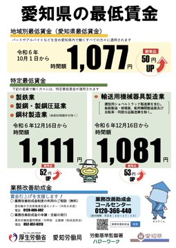 令和6年12月16日から、特定最低賃金が改定されます。※令和6年10月1日から12月15日までは、愛知県最低賃金(時間額1,077円)が適用され、高いほうの最低賃金額を支払うことになります。☆最低賃金..