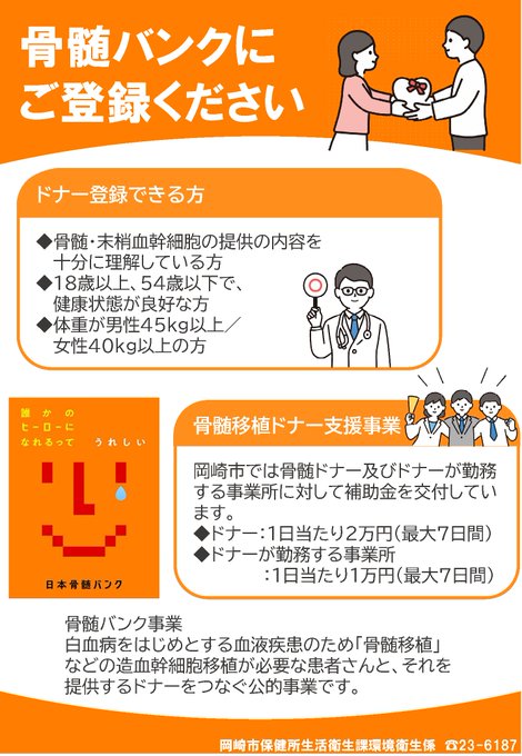 【骨髄バンクドナー登録に御協力お願いします】1人でも多くの患者さんを救うため、1人でも多くのドナー登録が必要です。岡崎市ではドナー登録していただいたかたに補助金を交付しています。詳しくは、市ホームペー..