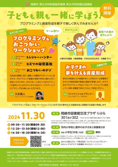 【子どもも親も一緒に学ぼう!プログラミングと資産形成を親子で楽しく学んでみませんか?】日時★11/30(土)①9時50分~②12時20分~③14時50分~場所★図書館交流プラザ定員★各回小学生30人と..