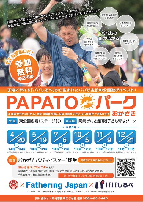【「PAPATOパークおかざき」を開催します!】公園にパパと子どもが集まって、パパ同士の交流を図る公園遊びイベントご家族でお気軽にお越しください日時:10/5(土)10時~12時場所:東公園広場※雨天..