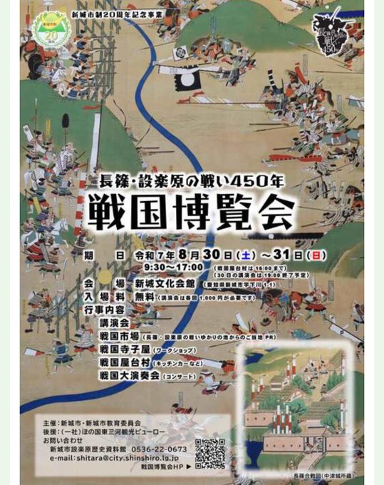 【戦国博覧会8/30,31開催】いよいよ今週末です。「長篠・設楽原の戦い450年」を記念して『戦国博覧会』が開催されます。各地の城や歴史関連のブースが一堂に集まった「戦国市場」、「戦国大演奏会」、「戦..