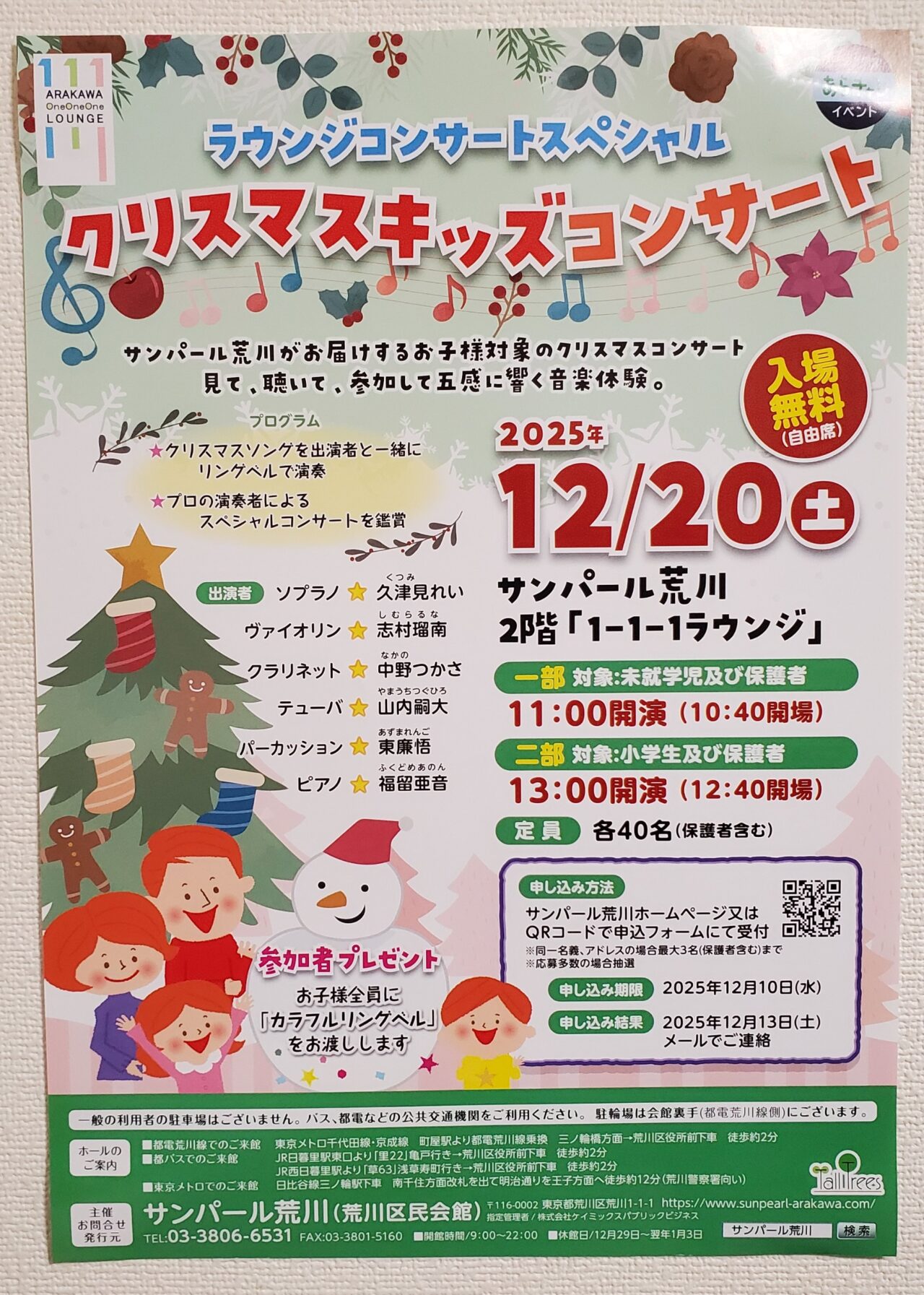 楽しいクリスマスシーズン。イベントも目白押しですね。ただ、小さいお子様連れの場合、どこに行こうか悩みませんか。お子様対象のイベントなら安心ですね。サンパール荒川でお子様対象の無料クリスマスコンサート
