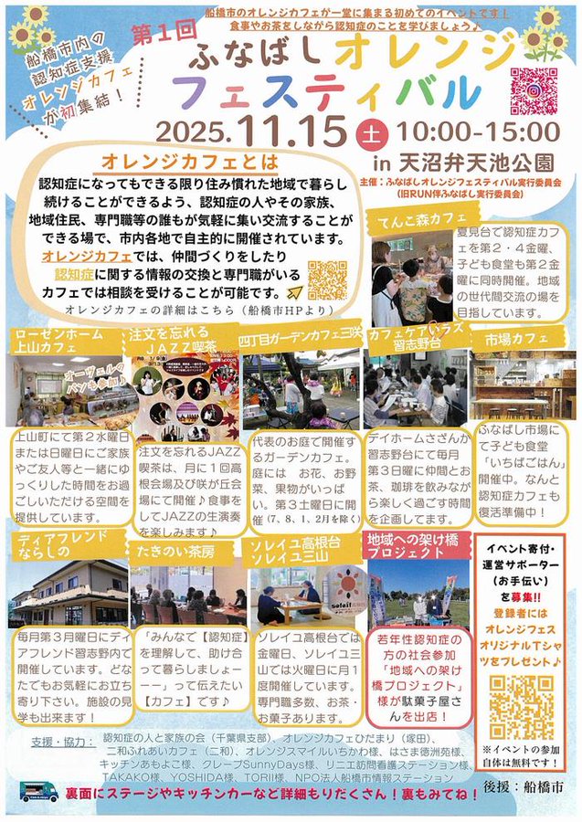 \\ふなばしオレンジフェスティバル開催!//キッチンカーを楽しみながら自分の街の認知症サポートについて理解を深めませんか?日時:11月15日(土)10:00~15:00場所:天沼弁天池公園認知症につい..