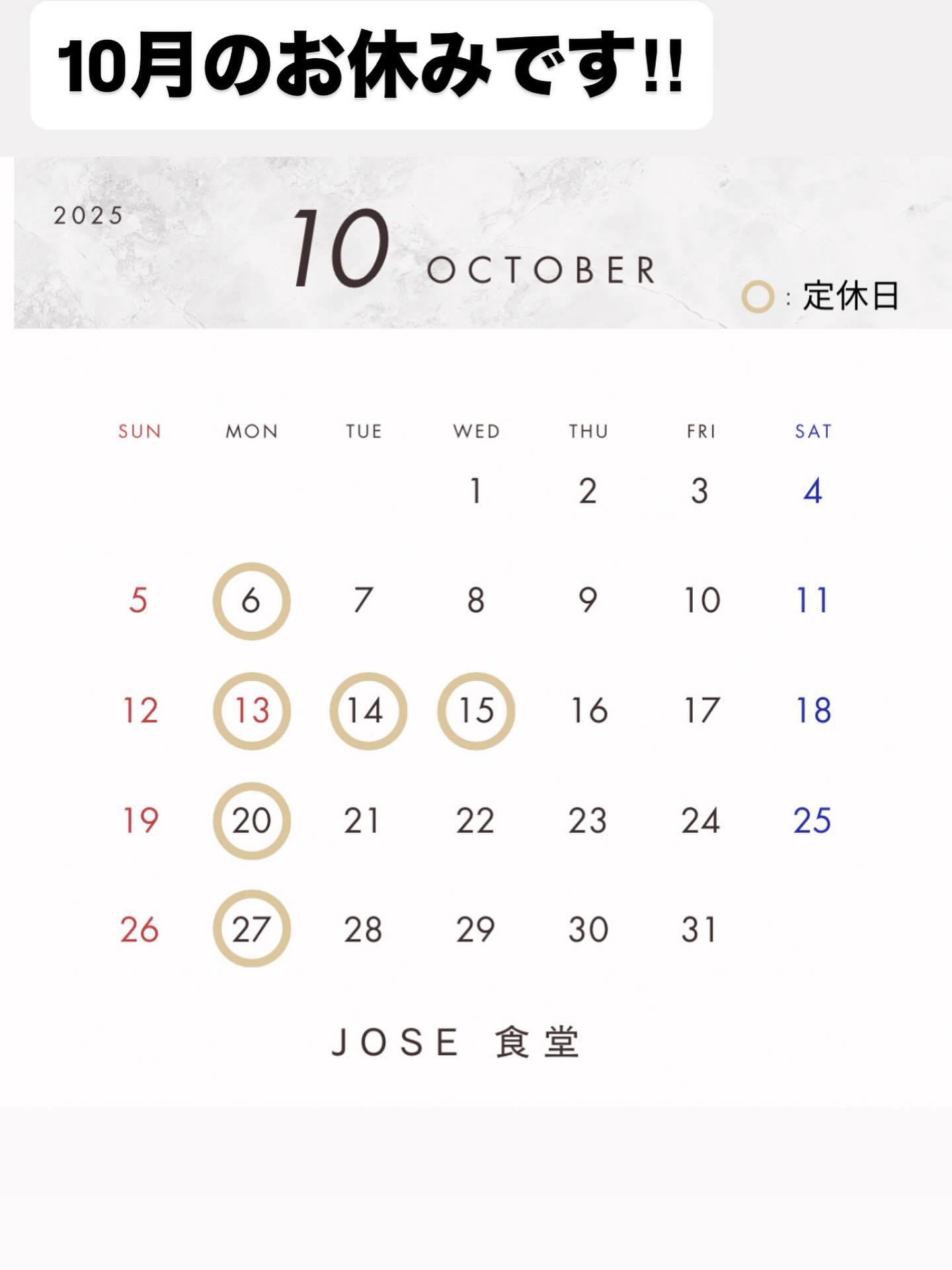 10月のお休みになります‼︎そろそろ、Xmasのメニューやホセチのメニューも決まりそうなので投稿しますね^^..
