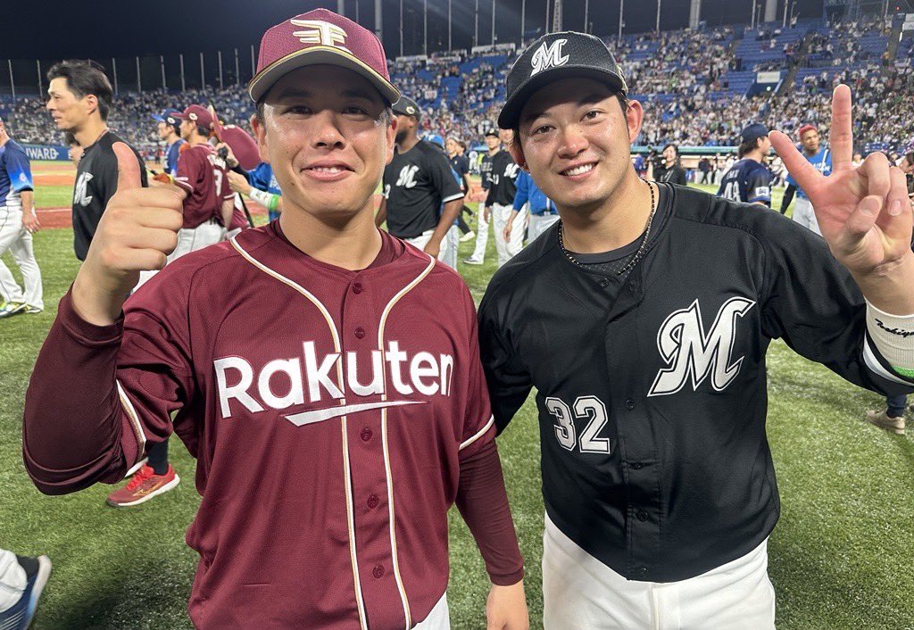 思い出の神宮でMVP。 大学の一つ上の先輩、イーグルス #藤井聖 投手も感無量の様子。 「おめでとう!都志也」と2ショット。 #chibalotte #広報 #RakutenEagles #佐藤都志也