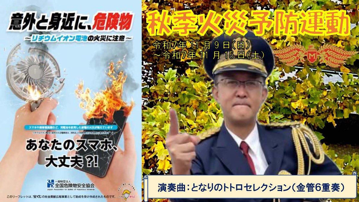 松戸市消防音楽隊が演奏動画を公開しましたとなりのトトロセレクション(金管6重奏)に合わせて秋季火災予防運動についてお知らせします。今回はリチウムイオン電池の注意事項のお話です。#松戸#リチウムイオン電..