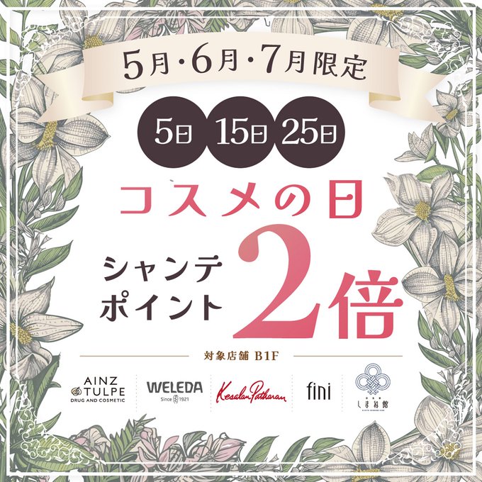 5〜7月限定!“5”のつく日(5日・15日・25日)は「コスメの日」下記の対象店舗をご利用でシャンテポイントが2倍◆アインズ&トルペ◆ヴェレダ◆ケサランパサラン◆フィニ◆日比谷しまね館詳しくは..