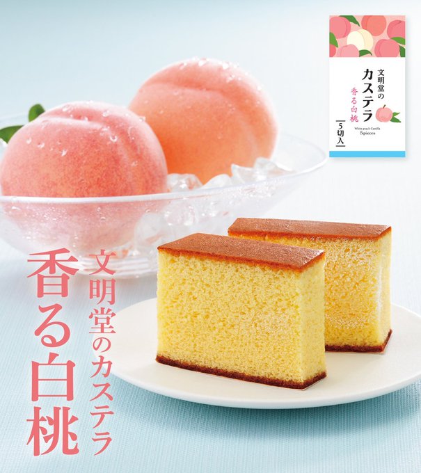 7/19(金)~発売開始!#文明堂東京【「文明堂のカステラ香る白桃」】濃厚な白桃ピューレを加え、みずみずしい香りを楽しめる夏にぴったりなカステラです。冷凍庫でひんやり凍らせてもお召し上がりいただけます..