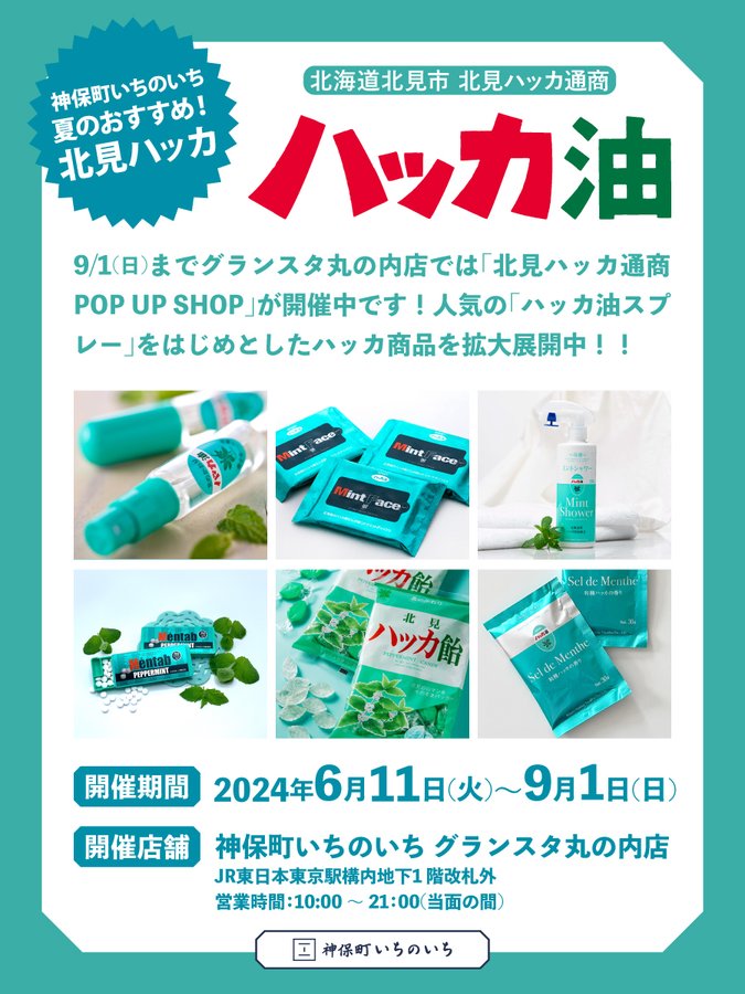 【9/1まで】グランスタ丸の内店にて大人気「#北見ハッカ通商」のハッカ商品をどどんと拡大展開中です店舗は東京駅丸の内地下南口改札を出て真っ直ぐ。動輪の広場を目印にお越しください。期間中は「ハッカ油BI..
