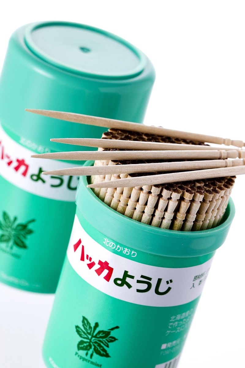 #北見ハッカ通商 北海道産白樺材を使った楊枝の先に北海道産和種ハッカ油が染み込んだ「ハッカようじ」。口に入れると爽やか~な香りが広がります お茶やお水に楊枝の先をつけて軽くかき混ぜると、ミントティーやハッカ水としてもお楽しみいただけます!