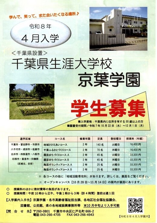 全頁及び拡大版は、下の文字列をクリックしてPDFをダウンロードしてご覧ください。⇒令和8月4月入学千葉県生涯大学校京葉学園学生募集(PDF)