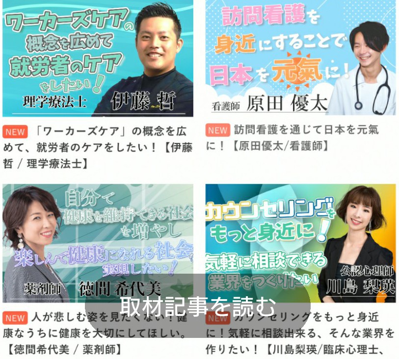 最初は医療ブログからスタートしました。ただ、私もそうですが医療従事者でありながら臨床に出ていなく、周りでもこのような働き方をしている医療職がいたので取材として取り上げることでその方を応援できると想い取材メディアとして確立。また、医療従事者の働き方として病院や現場に囚われたくない、そして自分の自己実現ができる働き方を望む医療従事者も多いのでその方たちを背中を押せるメディアになりたいと思いました。いったい誰の為に始めたのか?チャレンジしている医療従事者の為に、始めたことです。