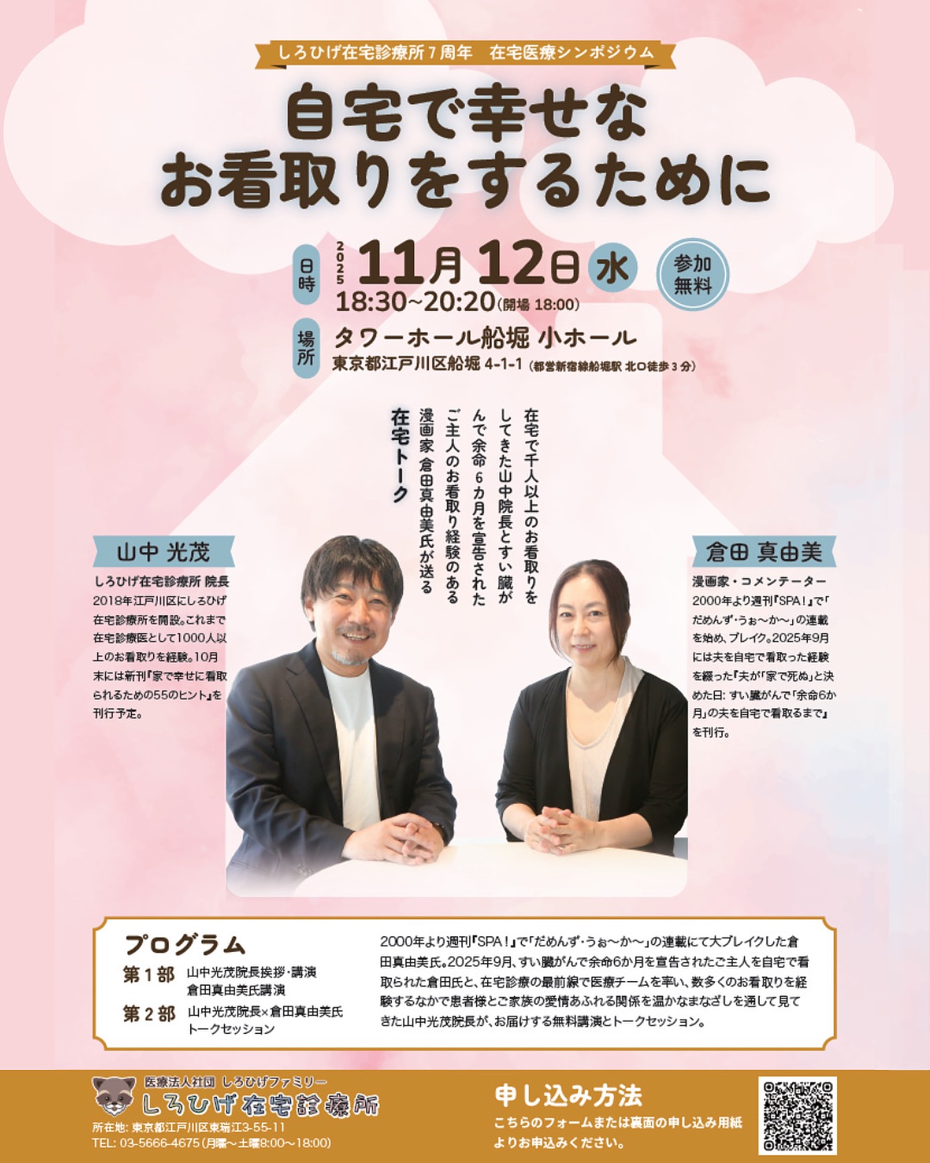 ・ いよいよ来週水曜日開催です!\開院7周年記念シンポジウム/「自宅で幸せなお看取りをするために」山中光茂×倉田真由美これまで在宅診療で1,000人以上のお看取りをしてきた、しろひげ在宅診療所院長山中..
