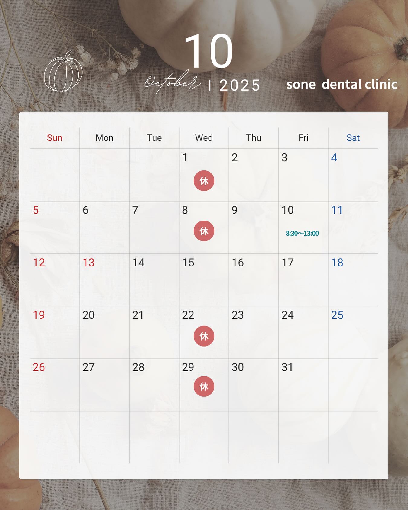 こんにちは🫶北九州市小倉南区のそね歯科クリニックです🦷10月の診療日お知らせ📢10月1日(水)休診1..