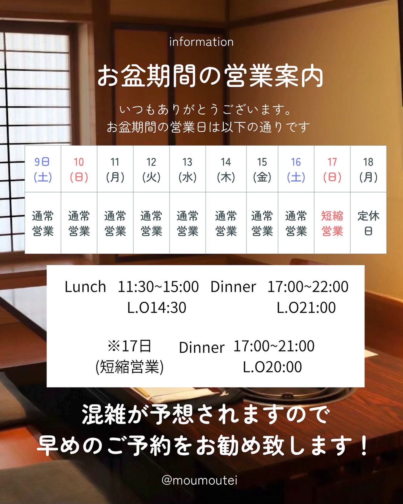 .お世話になっております!もうもう亭でございます🐃お盆期間の営業についてのお知らせです。お盆は全て営..